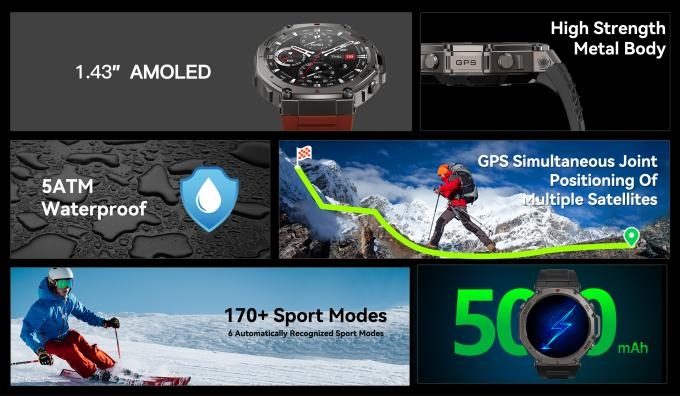 | Metal body, dustproof, drop-resistant, replaceable strap, 5ATM, AMOLED full-touch HD display, large-capacity high-voltage battery,simultaneous joint positioning of multiple satellites, multiple sensors,170+ sports modes,support heart rate,blood oxygen,air pressure,altitude,compass | |