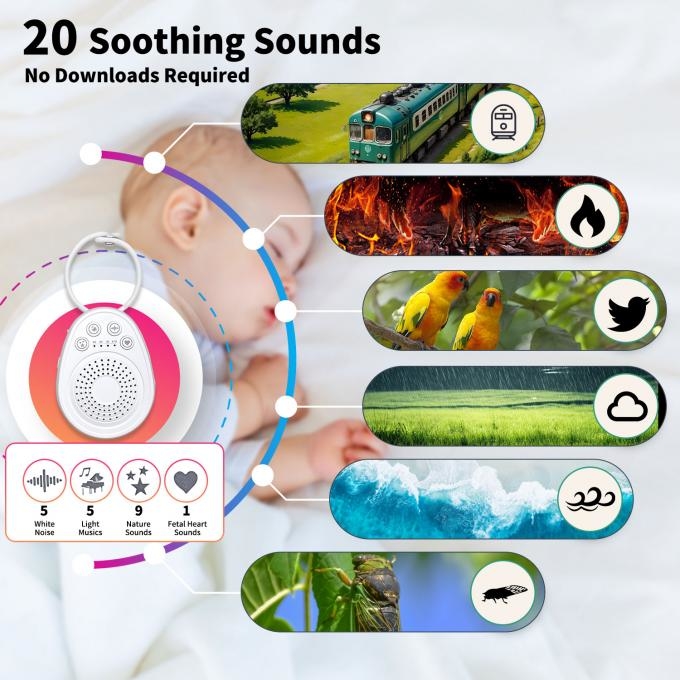 2. BUILT IN 20 SOUND SOURCES: There are 20 built in sound sources, including white noise, nature sounds, and fetal sounds, to meet different baby's sleep needs, and there is no need to connect to download to use it.