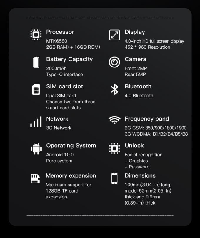 | ◇ Customer name | Project platform: MTK6580m/Andriod: 10.0/WCDMA:B1/B2/B4/B5/B8/GSM: 850/900/1800/1900/dual card/4.0 "Incell perforated screen 452*960 /Type-C USB/ Battery 2000mAh/ Bluetooth, WIFI, Vibration , | MINI 3G WCDMA Smart Phone | |||