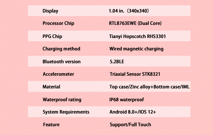 | music control, blood oxygen, continuous heart rate monitoring,camera remote, message notification, Sitting reminder, drinking reminder, alarm clock reminder, female tracker WeChat sports | ||||