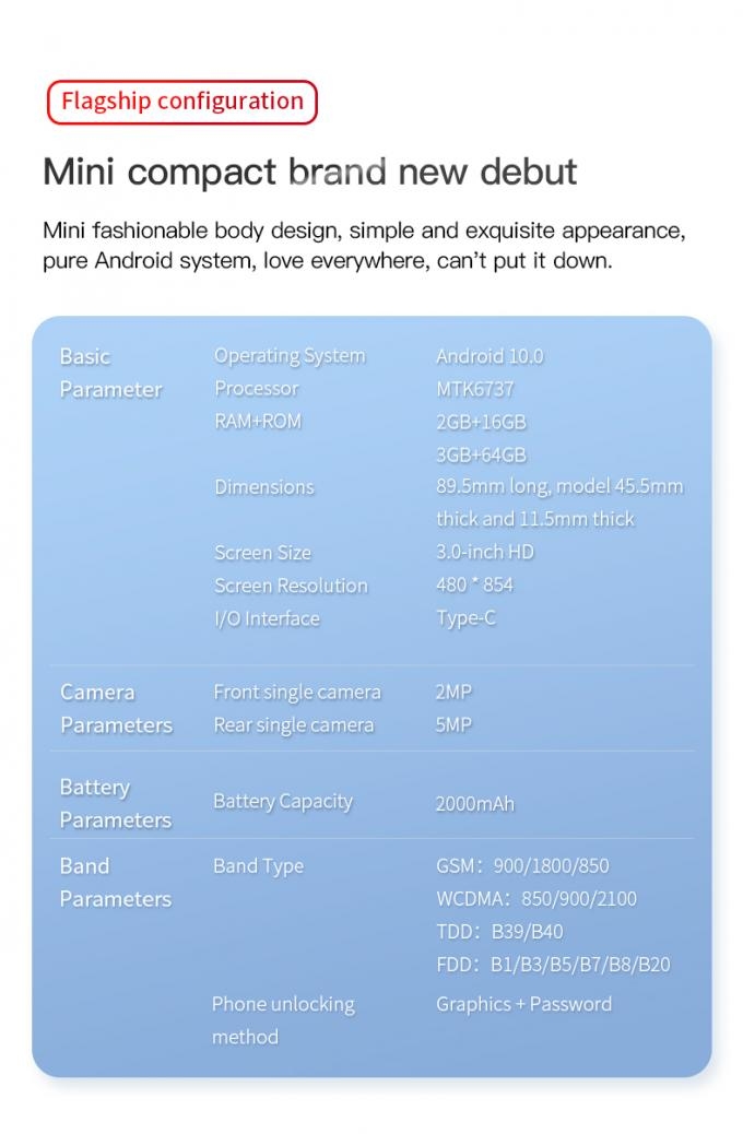 3+64GB Type C Dual SIM Small 4G Mobile Phones XS16 3.0''Android 10.0 Quad Core 2000mAh