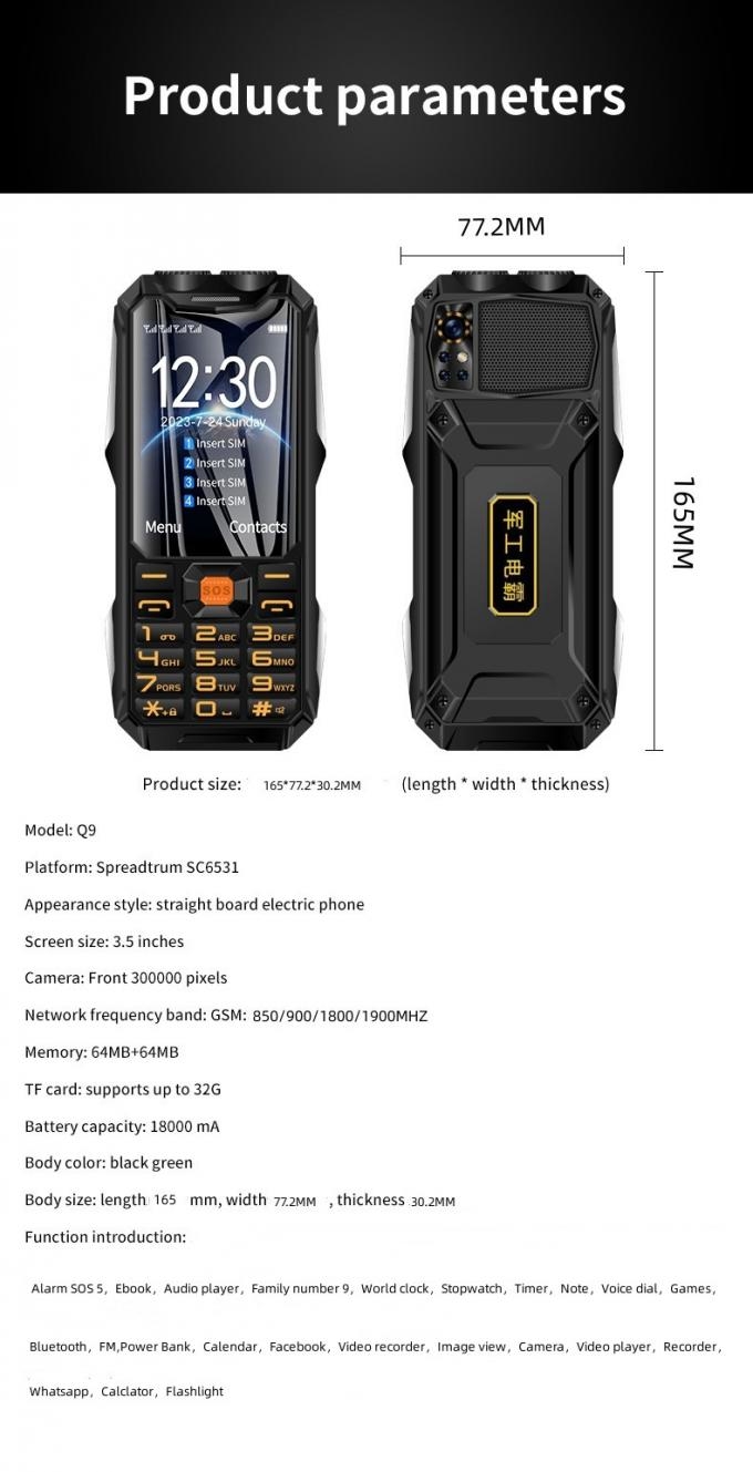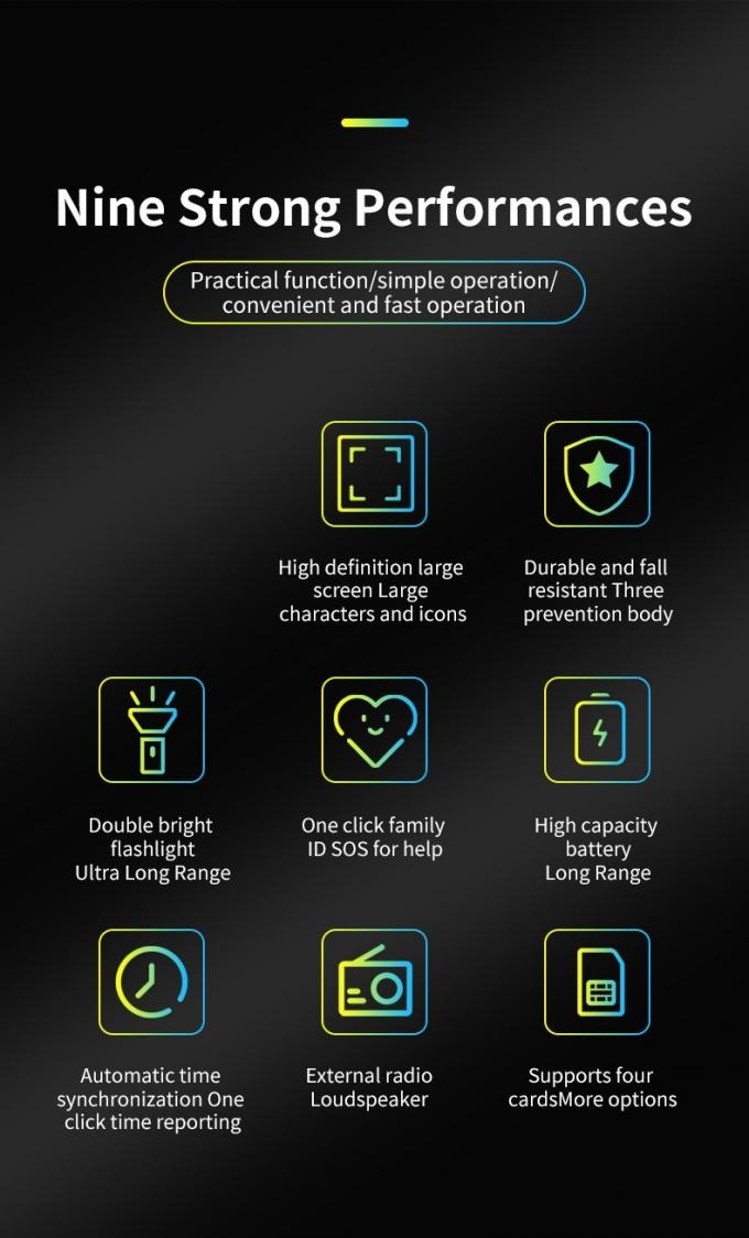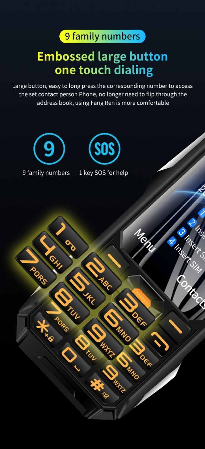 Function: Alarm SOS 5, Ebook, Audio player, Family number 9, World clock, Stopwatch, Timer, Note, Voice dial, Games, Bluetooth, FM, Power Bank, Calendar, Facebook, Video recorder, Image view, Camera, Video player ,Recorder,Whatsapp,Calclator,Flashlight,etc.