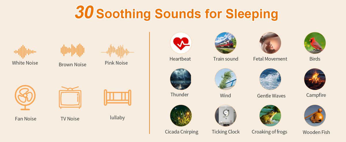 White Noise,Brown Noise,Pink Noise,Fan Noise,TV Noise,Birds,Heartbeat,Sound of running water,Forest,Train sound,Fetal movement,Lullaby,Thunderstomm,Croaking of frogs,Gentle Waves,Wind,Summer night,Music box,Campfire,Ticking Clock,Bubble sound,wooden fish.
