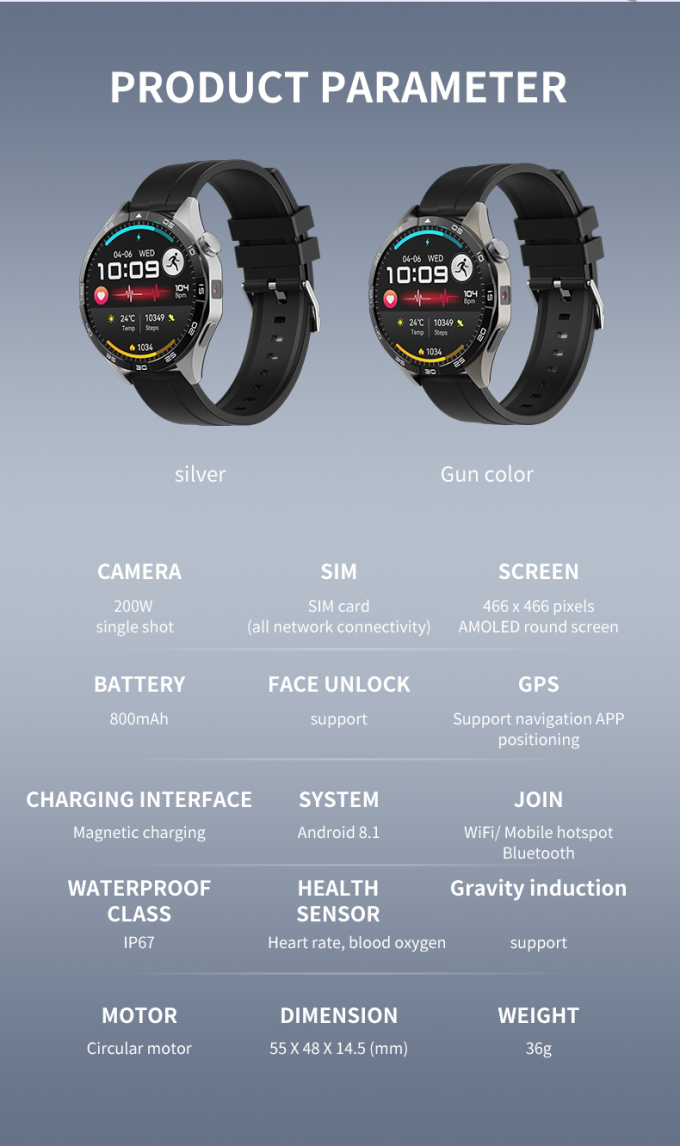 4G Smart Watch Global Call SC8541E 4-core CPU Android 8.1AMOLED Screen 780mAh Battery