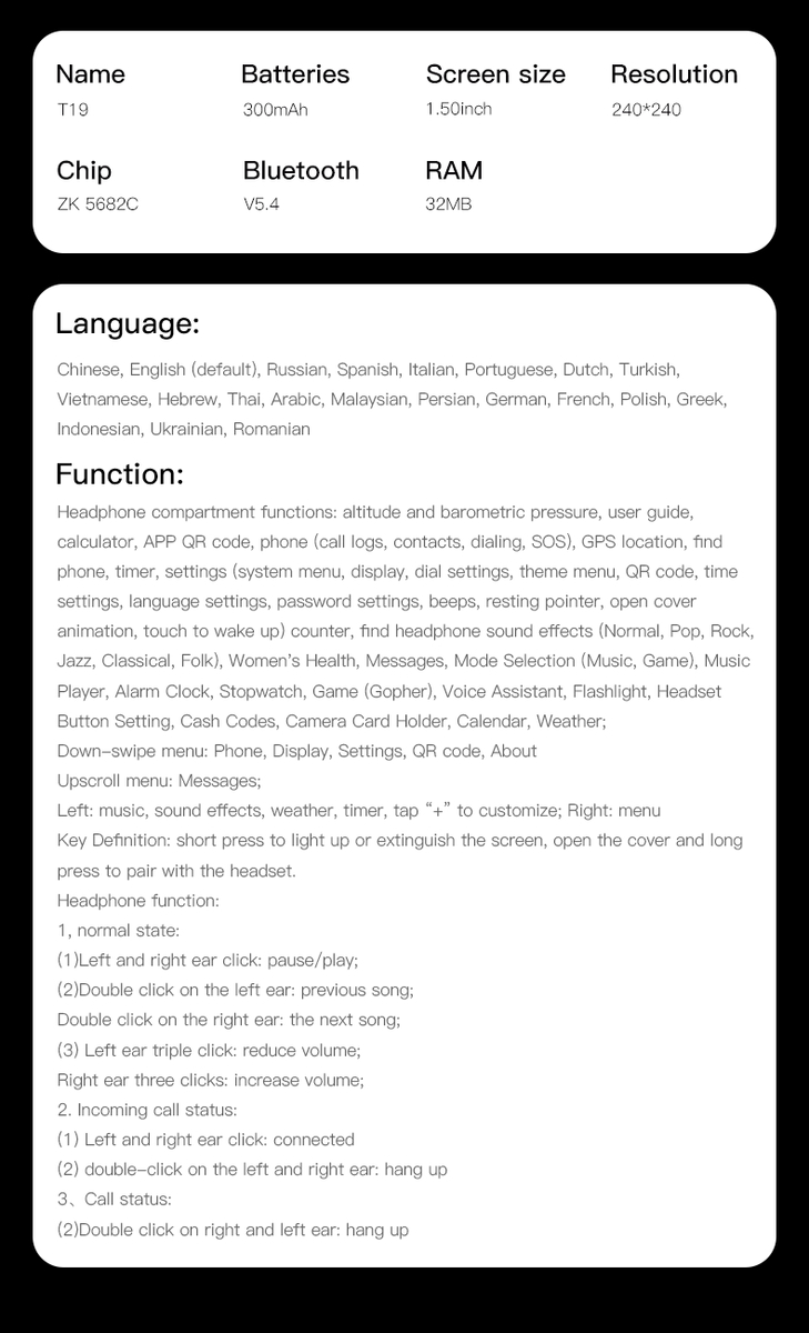 | function | Altitude Barometric Pressure, User Guide, Calculator, APP QR Code, Phone (Call Log, Contacts, Dialing, SOS), GPS Location, Find Phone, Timer, Settings (System Menu, Display, Dial Settings, Theme Menu, QR Code, Time Settings, Language Settings, Password Settings, Beeps, Rest Pointer, Lid Opening Animation, Wake Up By Touch) Counter, Find Headphones, Sound Effects (Normal, Pop, Rock, Jazz, Classical, Folk), Women's Health, Messages, Mode Selection (Music, Game), Music Player, Alarm Clock, Stopwatch, Game (Gopher), Voice Assistant, Flashlight, Headset Button Setting, Payment Codes, Camera, Card Holder, Calendar, Weather; Down-scroll menu: Phone, Display, Settings, QR code, About. Up-scroll menu: Messages; Left Swipe: Music, Sound, Weather, Timer, Tap “+” to customize; Right: Menu | ||