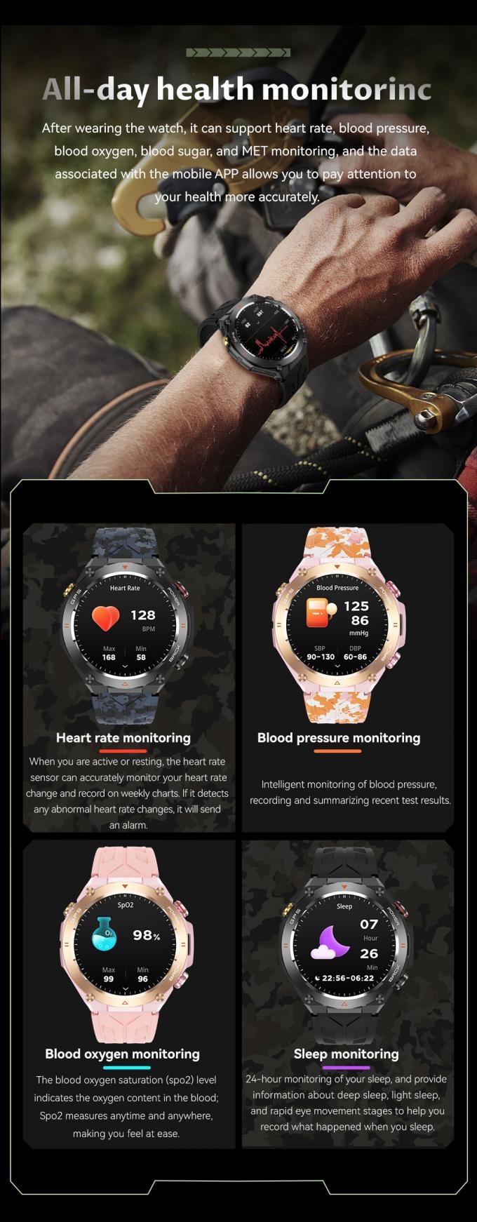 Functions: Built-in GPS, altitude, air pressure, compass function, AI voice assistant, Bluetooth call function, calculator, heart rate, blood pressure, blood oxygen, sleep monitoring, step counting, calories, distance, stopwatch, timer, brightness adjustment, scrolling Wrist-on screen, music control, alarm clock, phone search, 12 dial UI switching (customizable dials), Do Not Disturb mode, drinking water reminder, remote camera, menstrual reminder for women, heart rate warning, sedentary reminder, phone search, incoming calls Refuse to accept etc.