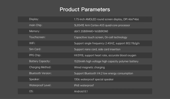 4G Android 8.1 AMOLED Display Smart Watch 1.75'' 2+16GB Quad Core 1520mAh Long Standby